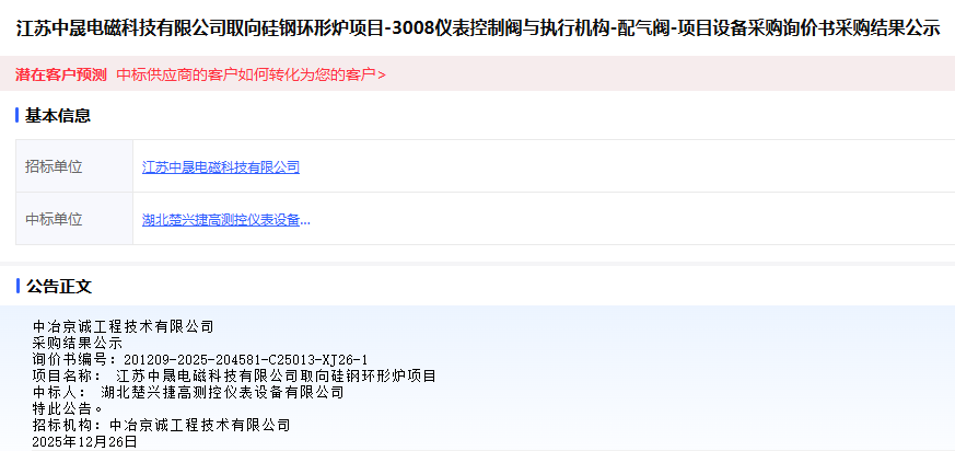 2025年12月26日 —— 公司成功中標北京京城鳳凰工業(yè)爐工程技術(shù)有限公司(以下簡稱“京城鳳凰院”)的取向硅鋼環(huán)形爐配氣閥項目,該設(shè)備將應(yīng)用于江蘇中晟電磁科技有限公司的生產(chǎn)線。這一重要中標標志著楚興捷高在高端特種閥門領(lǐng)域的技術(shù)實力再次獲得行業(yè)頭部企業(yè)的認可。
